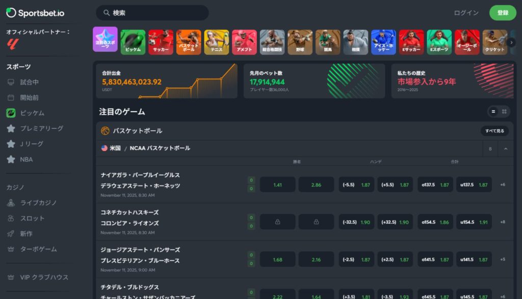 スポーツベットアイオー(Sportsbet.io)は2016年に創立されたブックメーカーサイトです。黒と緑の差し色が映えるサイトデザインとなっています。サイト名からもすぐ理解できると思いますが、スポーツベットに特化しているのが特徴です。他サイトと比較して同じ対象のオッズが高く設定されていたり、対象であるなら購入時にオッズを引き上げることができる独自機能が利用できるなど、リターン額アップを図るプレイヤーにはおすすめですね。