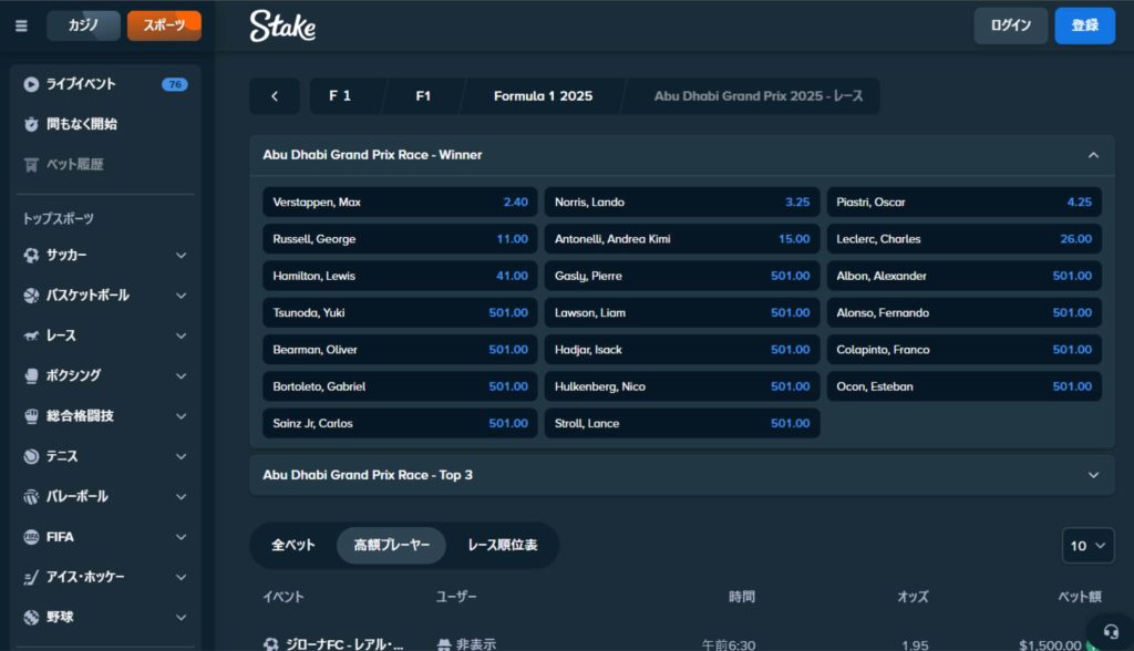 ステーク(Stake)は2021年に日本市場へ参入したブックメーカーサイトで、決済方法として仮想通貨による決済に特化しています。今回のF1世界選手権2025シーズンに参戦中のステークF1チームのメインスポンサーとして有名です。仮想通貨決済で利用できる通貨はビットコイン・イーサリアムだけでなく、その他複数種類のアルトコインも利用可能です。もし、仮想通貨を所有していない場合も、法定通貨を用いた決済方法を利用して遊べます。