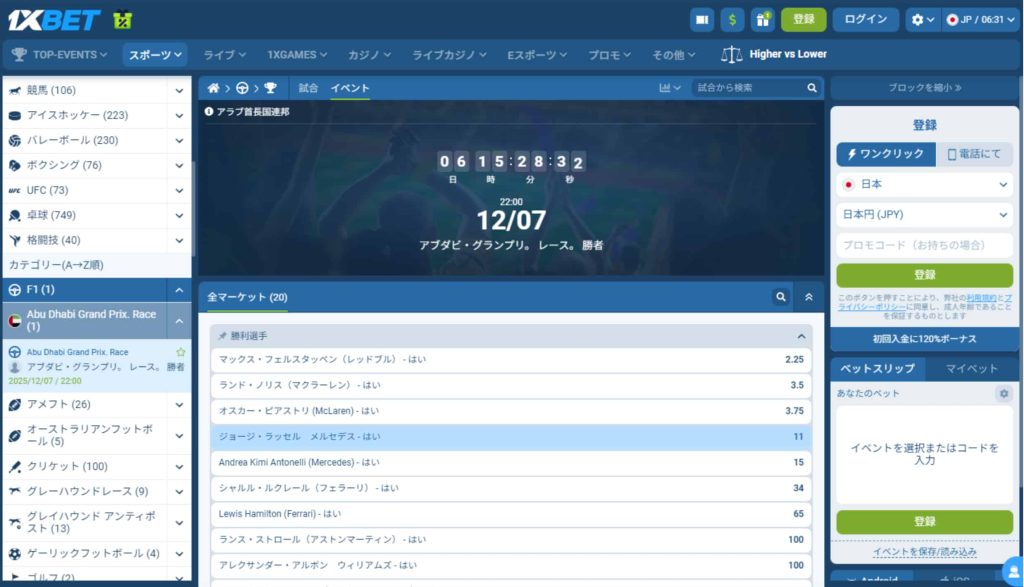ワンバイベット(1xBET)は2007年に創業されたブックメーカーサイトで、利用するプレイヤーには東欧圏最大規模を誇るブックメーカーサイトであると評価されることが多いです。今回のF1選手権のレースのオッズを取り扱う予定のF1カテゴリのほかに、サッカー・野球・テニスといった世界中で開催されるスポーツカテゴリに対して、1日に1,000を超えるオッズが公開されていることからも、ここのサイトの規模が大きいと把握できるでしょう。