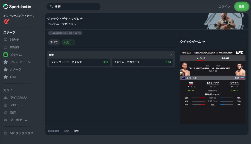 2016年に創立されたスポーツベットアイオー(Sportsbet.io)は、サイト名の通りスポーツベットに特化したブックメーカーサイトです。今回のUFCのオッズについては総合格闘技カテゴリから公開される予定で、それ以外にも野球・サッカー・テニス・バスケットボールなどの世界中で開催される試合や大会へのベットが可能です。他サイト比で高いオッズが設定されたり、購入時にオッズ引き上げ可能な独自機能を利用することも可能となっています。