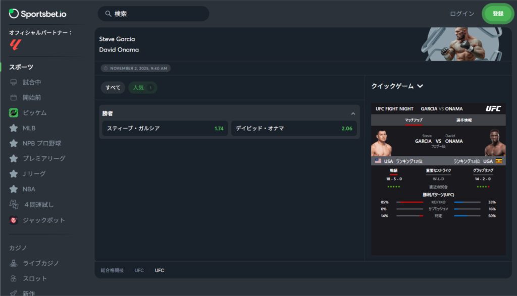 2016年に創立されたスポーツベットアイオー(Sportsbet.io)は、サイト名からも分かりますがスポーツベットに特化しているブックメーカーサイトです。UFCの大会で開催予定の各試合のオッズは総合格闘技カテゴリから提供予定となっています。他サイトと比べ同じ対象に設定されるオッズの値が高かったり、対象試合の場合にベット時にオッズの引き上げが可能となる独自機能を利用することができるなど、リターン額アップを狙うことができます。