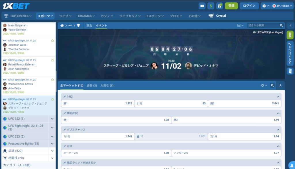 2007年に創業されたワンバイベット(1xBET)は、利用するプレイヤーの間で特に東欧圏最大規模を誇るブックメーカーサイトとして評判の大きいブックメーカーサイトです。今回の試合のオッズが提供されるUFCカテゴリが独立しているほか、サッカー・野球・バスケットボールなど多数のスポーツカテゴリが提供中です。これらのカテゴリに対し、1日に1,000を超えるオッズが公開されているため、このサイトの規模が大きいことが見えてきますね。