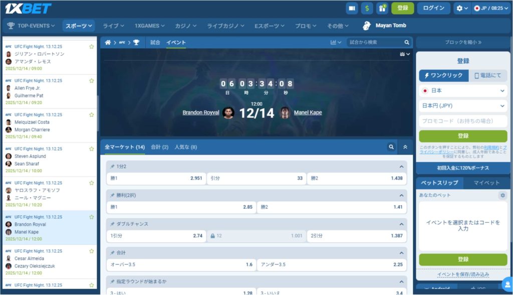 2007年に創業されたワンバイベット(1xBET)は、利用するプレイヤーからは東欧圏最大規模を誇るブックメーカーサイトであるという高い評価を受けています。今回の試合のオッズは独立したUFCカテゴリから提供予定で、その他にもサッカー・野球・バスケットボールのようなスポーツカテゴリが多数提供されています。提供される各カテゴリ内において1日に1,000を超えるオッズが公開されることから、サイトの規模の大きさが想像できますね。